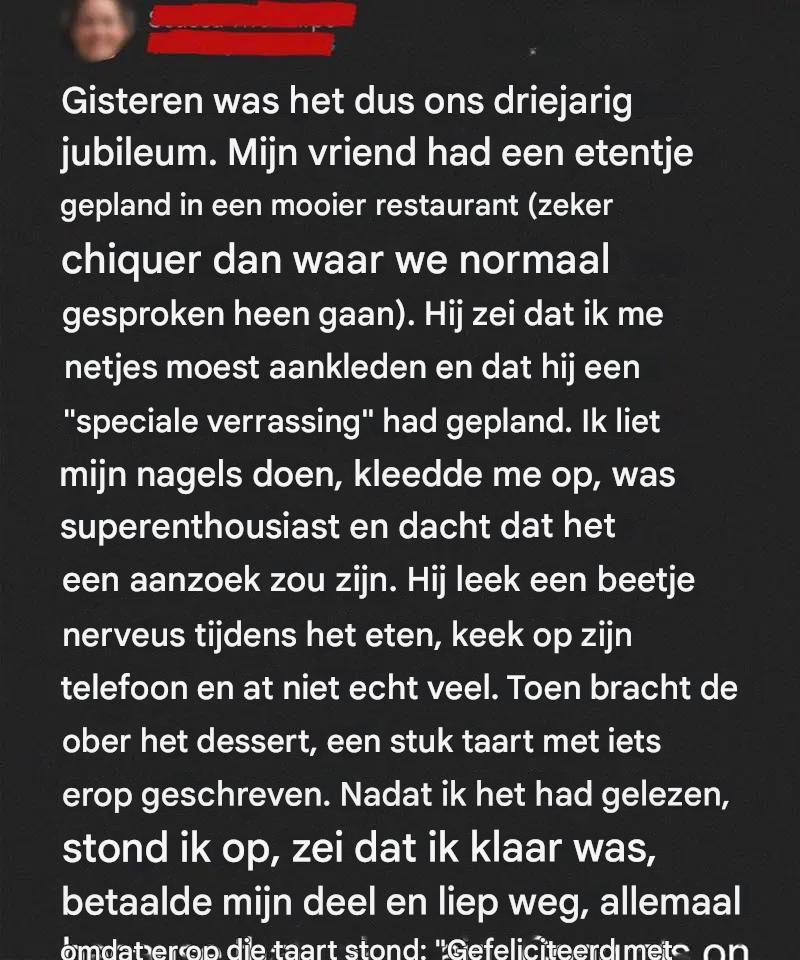 Hij reserveerde een tafel bij een chique restaurant, zei dat ik me netjes moest kleden en hintte op een ‘speciale verrassing’.