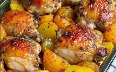 Ingrediënten: 6 kippendijen (bot-in, skin-on) 800g (1,75 lbs) babyaardappelen, gehalveerd of in vieren 3 eetlepels olijfolie 4 teentjes knoflook, gehakt…