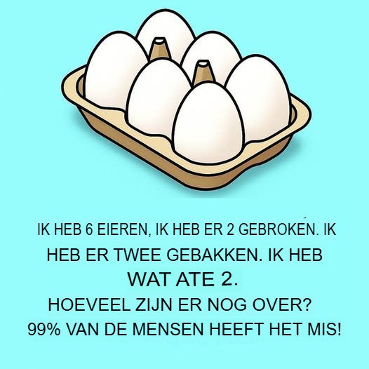 « Ik heb 6 eieren. Ik heb er 2 gebroken, 2 gebakken en 2 opgegeten. Hoeveel eieren heb ik nog over? »